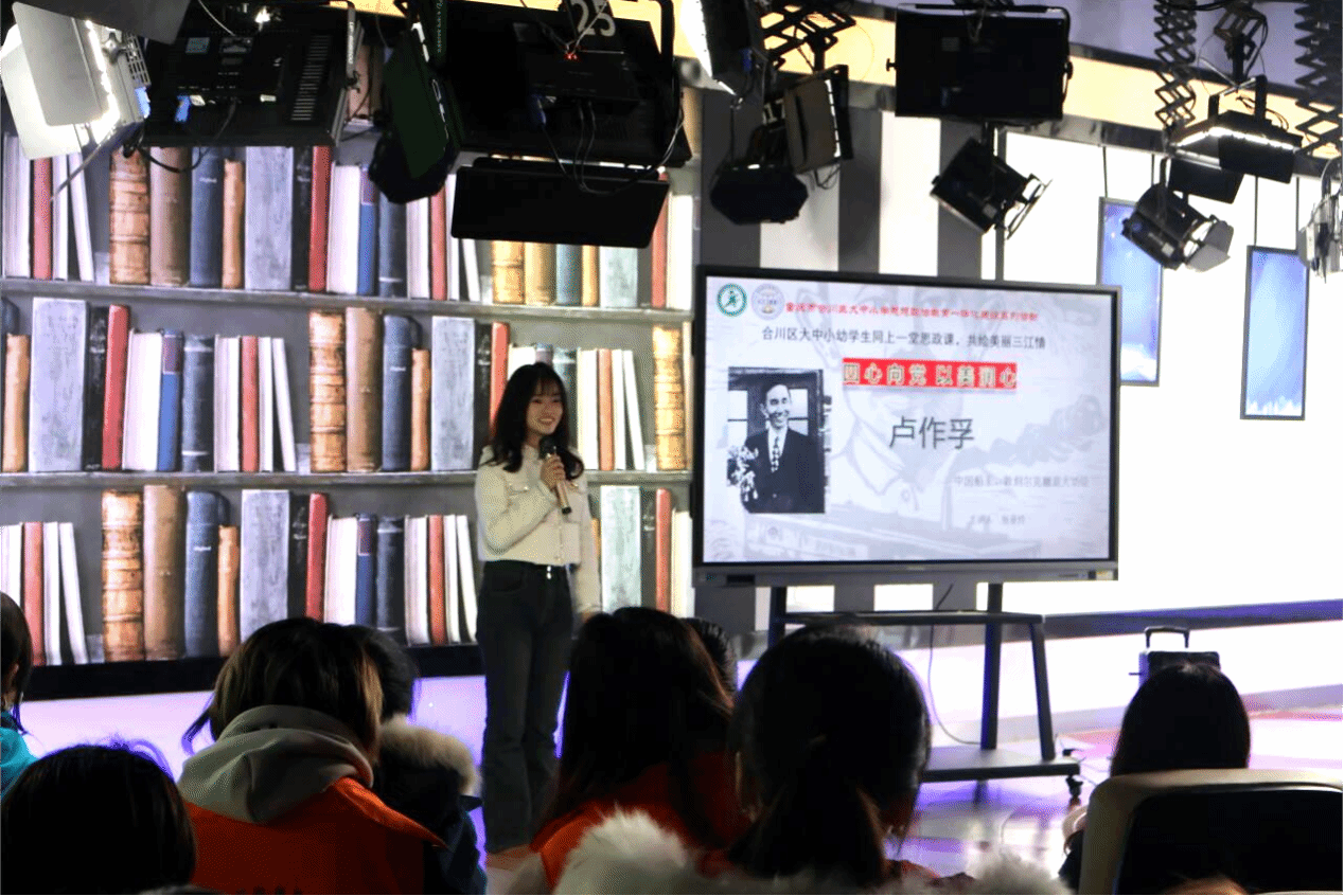 首先,由学校艺术设计学院艺术教育专业的大学生进行“家乡名人微故事”和“家乡名景微宣讲”向在场的大中小幼学生代表讲述:人民教育家陶行知“四颗糖的故事”、“爱国企业家的典范”卢作孚、“坚守原则,公而忘私”的模范少先队员刘文学、“爱莲君子”周敦颐、“清代第一廉史”于成龙、川剧艺术家吴晓雷、合川的骨鲠之气张森楷等一个个扣人心弦的英雄故事,这不仅拉近了同学们与合川名人的距离,更让他们在一个个生动的故事中领略先辈们的精神气节。课堂最后,大学生们深挖合川明景珍宝对合川钓鱼城、涞滩古镇、合川峡砚、文峰塔进行讲解让同学们更加了解合川,热爱合川。