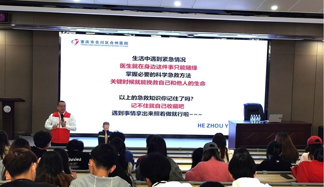 为提高学生的应急救护能力,增强安全防范意识,3月25日下午15:00,学校体育运动委员会、学生处在合川B校区1113联合开展应急救护培训。合州医院门急诊主任、副主任医师李运泽,门急诊护士长、副主任护师刘军受邀为广大学生开展知识宣讲与实操演练。