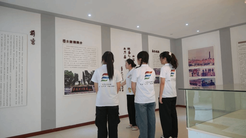 仪式结束后,实践团参观了烈士陵园陈列馆。馆内墙上记录着烈士们的英雄事迹,展示着革命烈士证明书的复印件以及迁葬前烈士墓的照片。成员们认真阅读,深刻感受革命先辈的英勇事迹,表达出对先辈的深深敬重。