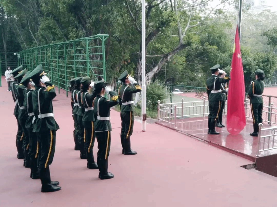 升旗仪式开始,国旗队队员们抬头挺胸,踏着正步,护送着五星红旗走向国旗台。全体同学肃立,伴随着嘹亮的国歌响起,五星红旗冉冉升起,随风飘扬。