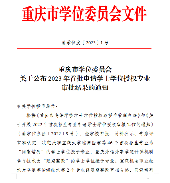 重庆市学位委员会下发了《重庆市学位委员会关于公布2023年首批申请学士学位授权专业审批结果的通知》(渝学位发〔2023〕1号)文件,学校大数据管理与应用、运动康复、艺术教育专业顺利通过重庆市学位委员会学士学位专家组的评审,取得学士学位授予权。