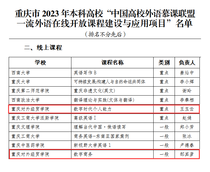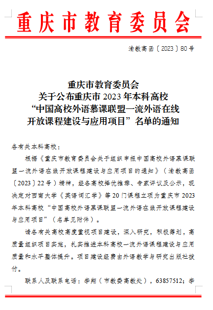 近日,重庆市教育委员会下发了《关于公布重庆市2023年本科高校“中国高校外语慕课联盟一流外语在线开放课程建设与应用项目”名单的通知》(渝教高函〔2023〕80号),全市共20门课程立项。学校外语外贸学院申报的线上课程《数字时代个人能力》《数字商务》成功获批并立项建设,其中《数字时代个人能力》被列为线上课程重点项目,这是今年会在课程建设方面取得的又一重大突破。