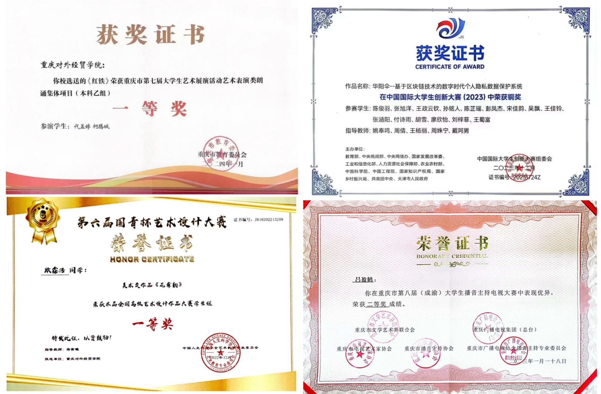 近三年,学院学子年均获得大学生广告设计大赛全国二等奖、2020ACA世界大赛中国总决赛季军,亚洲微电影艺术节金海棠奖、北京国际电影节舞蹈影像季入围奖、StarS 亚洲国际电影节短片入围奖等学科竞赛奖项225项;获中国国际大学生创新大赛获国家级铜奖1项、重庆市1金2银4铜;“挑战杯”中国大学生创业计划竞赛获重庆市1金1银。孵化出“嘉嘉在重庆”(102.2W)等多个50万+内容创作者,培育出重庆广积粮集团新媒体负责人、重庆文旅推广官卢思竹,灰海集团董事长陈俊羽等一批创业典型。近三届平均毕业去向落实率为93.98%,涌现出一大批如香港凤凰卫视余镓驰、江苏卫视高宇楠等优秀学子,先后有多名同学考取昆士兰大学(QS40)、中国传媒大学、香港浸会大学等境内外知名高校的研究生。