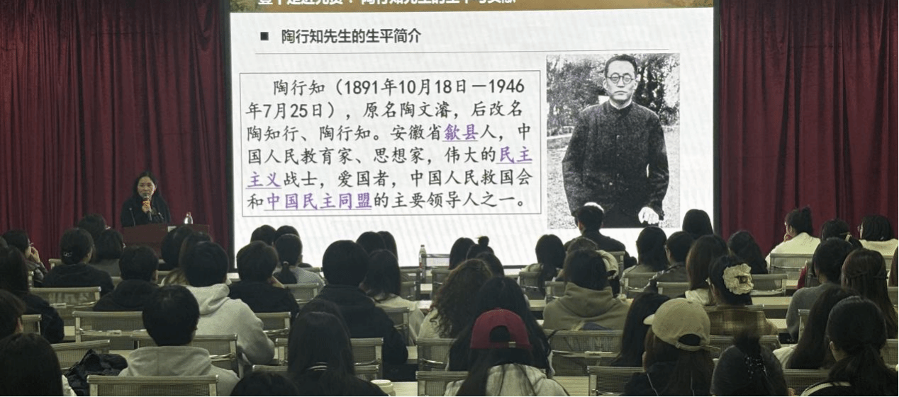 李俐均院长以历史脉络为主线,从陶行知先生的生平与贡献展开,通过晓庄师范建校历程、育才学校办学日记等珍贵史料,系统阐释了陶行知教育思想的演进图谱。陶行知先生从早期借鉴杜威“教育即生活”理念,到创新性提出“生活即教育”“社会即学校”“教学做合一”三大主张,构建了具有中国特色的平民教育体系。讲座特别聚焦“小先生制”“山海工学团”等经典案例,生动展现了陶行知将书房搬进牛棚、把课堂延伸到田间的教育实践,强调其“知行合一”理念对当代教育改革仍具重要启示。