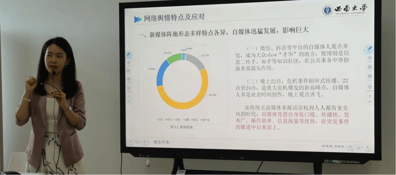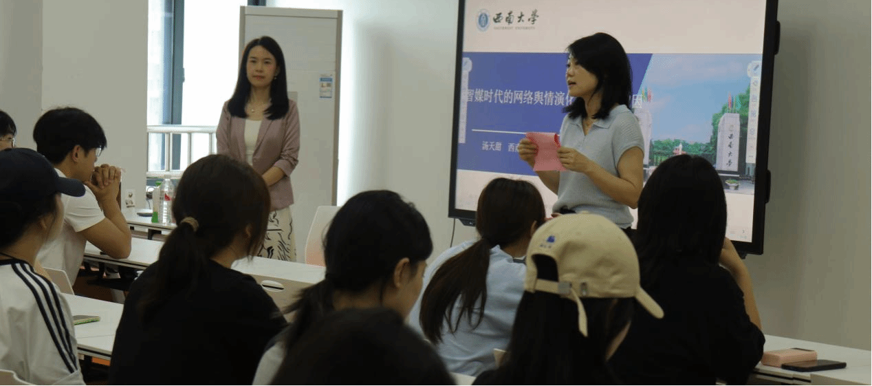 为提升学生对智媒时代网络舆情的专业认知与思辨能力,影视融媒体学院于2025年6月3日在合川A校区9623教室举办“HI大家好艺术沙龙”之“智媒时代的网络舆情演化及其风险归因”专题讲座。本次讲座由学院常务副院长王杨丽主持,西南大学新闻传媒学院教授汤天甜主讲。