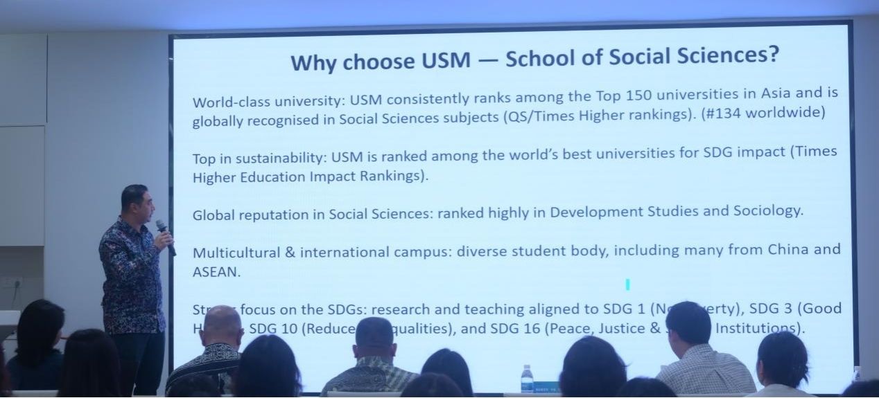 【本网讯】为拓宽学子的国际化视野,深化跨文化传播与数字创新教育实践,影视融媒体学院于2025年8月下旬与马来西亚理科大学社会科学学院深度合作,联合学校国际交流处,组织了13名师生赴马来西亚开展“跨文化传播与数字创新研学营”。为充分总结研学成果、促进经验共享,学院于9月17日上午在9418会议室举办了交流分享会。马来西亚理科大学社会科学学院院长莫哈末沙哈鲁丁·桑苏里詹、副院长帕拉姆吉特·辛格·贾米尔辛格、博士生导师庄坚祥博士,以及影视融媒体学院常务副院长王杨丽共同出席分享会。