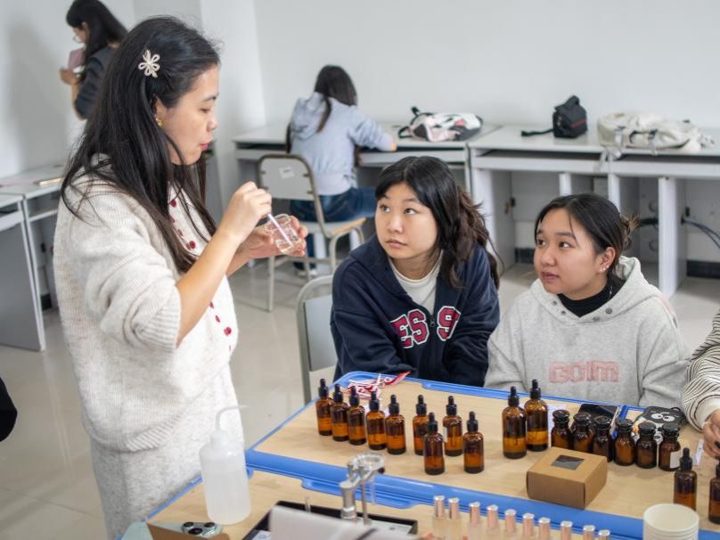 调香环节由Mare·Foresta海·森林品牌创始人张思思老师指导。张老师先讲解香料特性、精油调配比例等理论知识,再指导实践。同学们挑选香水后,按配方比例混合精油与调香剂,经过滤、装瓶,自制香水静置15天即可使用。